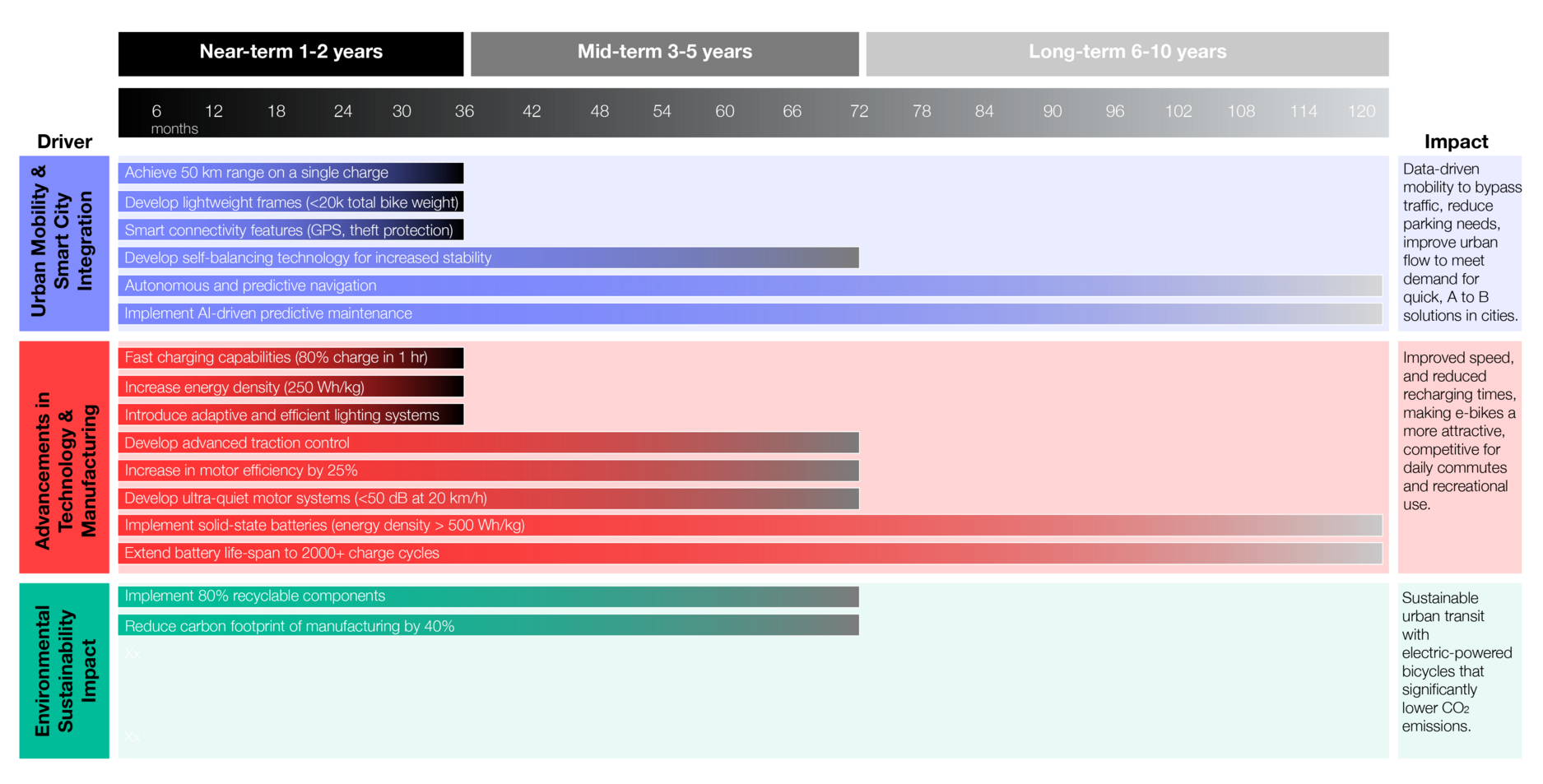 By focusing on these strategic drivers and capability milestones, the e-bike industry can continue to innovate and expand its market presence over the next decade, addressing key challenges in urban mobility, sustainability, and technological integration.