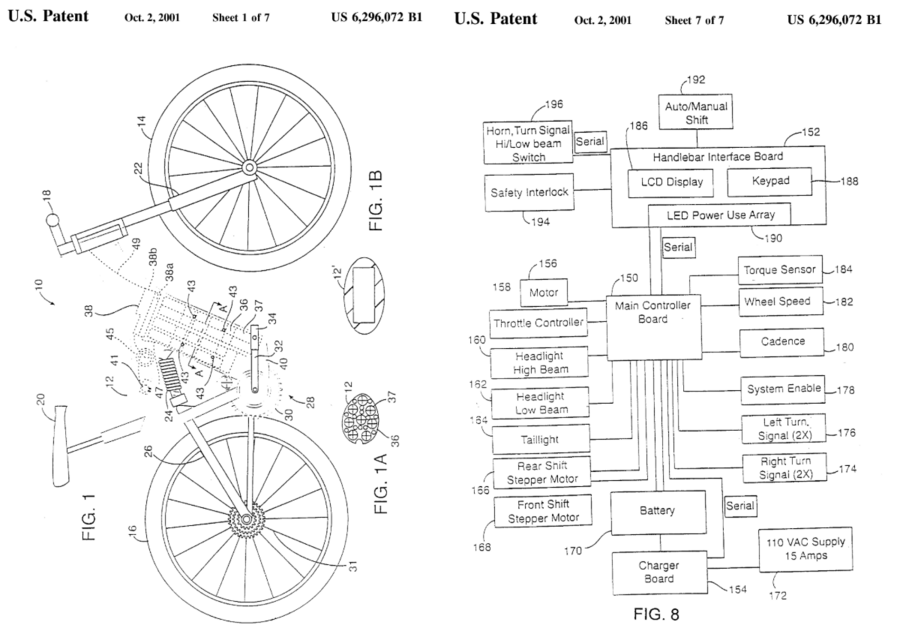 Details: This patent by James R. Turner revolutionized e-bikes with an electric assist motor integrated into the bottom bracket. It introduced gears to improve motor efficiency, extending battery life. The design emphasized compatibility with existing bicycle equipment and featured a modular motor system with integrated clutch and gear reduction mechanisms.