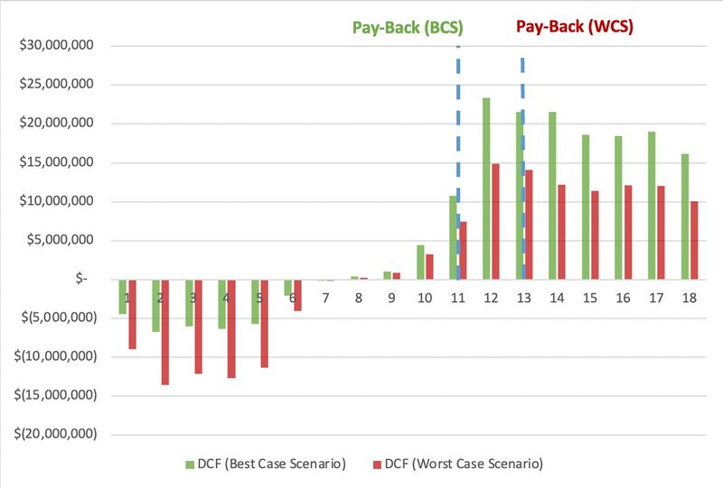 The figure below shows the result of our analysis, each bar represents the present value of the cash flow at a given point in time, reflecting the profitability and viability of the investment under these specific conditions.