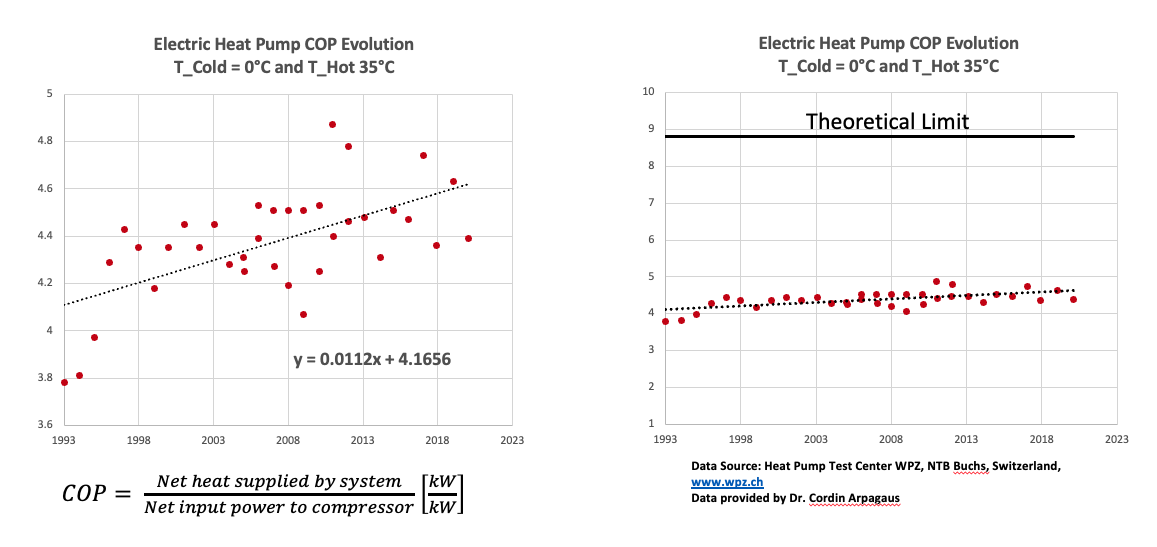 The top left figure above illustrates the improvement trend of the Coefficient of Performance (COP) for electric heat pumps over a span of approximately three decades, from the early 1990s to 2020 (Heat Pump Test Center WPZ, NTB Buchs, Switzerland, www.wpz.ch). The COP is an important figure of merit that indicates the efficiency of a heat pump at specific temperature conditions — in this case, when the cold side (T_Cold) is at 0°C and the hot side (T_Hot) is at 35°C. The top right figure highlights the theoretical limit which indicates the maximum possible COP as dictated by the Carnot efficiency, which is a theoretical limit based on thermodynamic principles. It also shows the large available room for improvement.