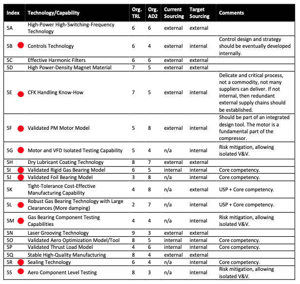 The Design Structure Matrix (DSM) presented below is a strategic tool that showcases the interdependencies among various technologies and capabilities required for the development of a high-efficiency heat pump system. It highlights key capabilities such as robust gas bearing design tools and key technologies, such as high-frequency variable frequency drives, demonstrating how each element is interconnected and essential for the overall performance and competitiveness of the system. This DSM enables us to understand and manage the complexities of our technology development processes, ensuring that we can prioritize and sequence tasks effectively to achieve our innovation objectives.