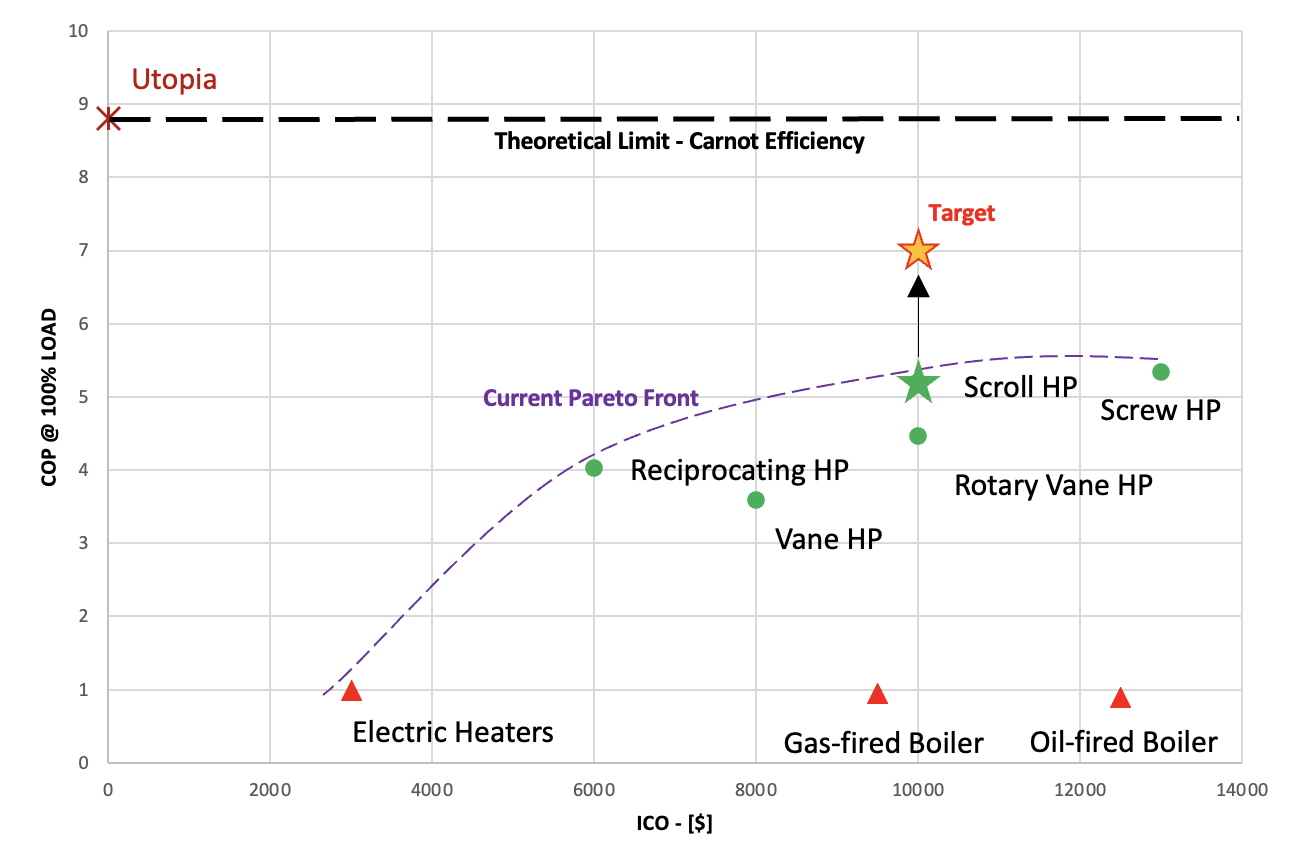 This figure shows the trade-off between the COP and the ICO for various heating technologies. The COP at 100% load is plotted on the vertical axis, signifying the efficiency of each technology in converting energy to heat, while the horizontal axis represents the ICO, reflecting the initial investment required to purchase and install the technology. "Utopia," representing an ideal but unattainable state (currently) of highest efficiency at the lowest cost, and "Target," indicating the aspirational goal for our company that we aim towards.