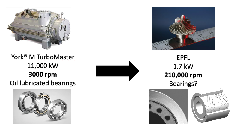 Centrifugal technology is the preferred choice for industrial settings where high efficiency and reliability are paramount. The York® M TurboMaster, a large-scale industrial compressor, operates at a power level of 11,000 kW and a rotational speed of 3000 rpm, using oil-lubricated bearings, which are typical for large-scale machinery. On the other hand, the EPFL compressor represents an attempt for a scaled-down refrigerant centrifugal compressor, operating at a much lower power level of 1.7 kW but at a significantly higher rotational speed of 210,000 rpm. This increased rotational speed is a key factor in maintaining the efficiency of the compressor at a smaller scale. However, traditional bearing technology, such as oil-lubricated bearings used in large compressors, will not be suitable at these higher speeds. Therefore, the development of advanced bearing technologies becomes the enabling technology for the successful downscaling of centrifugal compressors. Innovations such as magnetic bearings or gas bearings might be required to handle the high rotational speeds without the limitations posed by conventional bearings. These advanced bearings could enable the miniaturization of centrifugal compressors, making them viable for residential applications where space constraints and noise levels are significant considerations.