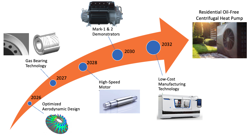 The technology strategy for the depicted roadmap is focused on achieving a groundbreaking Residential Oil-Free Centrifugal Heat Pump system by the year 2032. Our journey begins with the development of an optimized aerodynamic design in 2026, setting the foundation with enhanced efficiency and reduced noise. By 2027, we aim to integrate advanced gas bearing technology, a key enabling technology that ensures an extended lifespan for the heat pump. Progressing towards 2028, our focus will shift to incorporating in-house high-speed motor capabilities, which is expected to deliver superior performance and reliability.