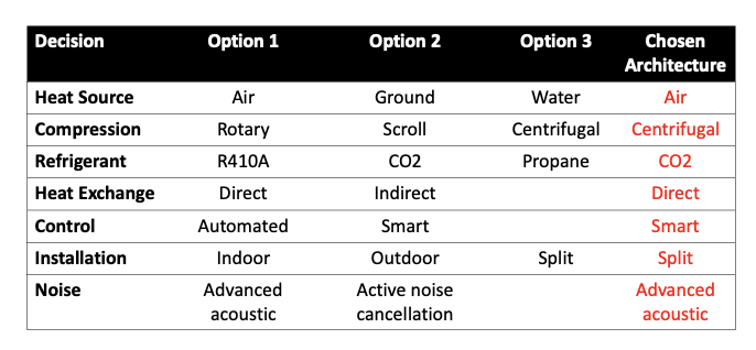 The table below presents a comparison of different technological decisions for the heat pump system across various categories such as heat source, compression type, refrigerant used, heat exchange method, control system, installation location, and noise reduction technology.