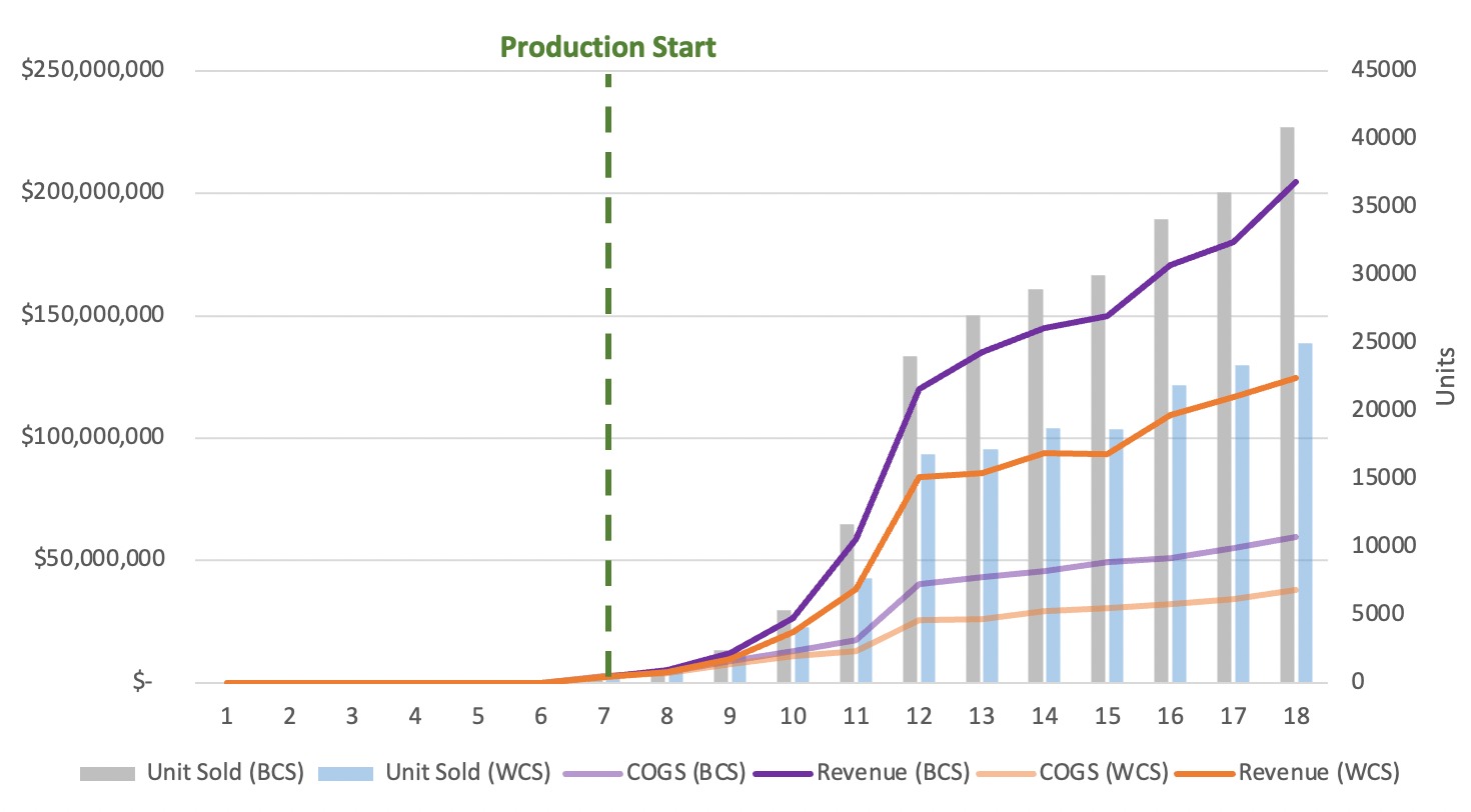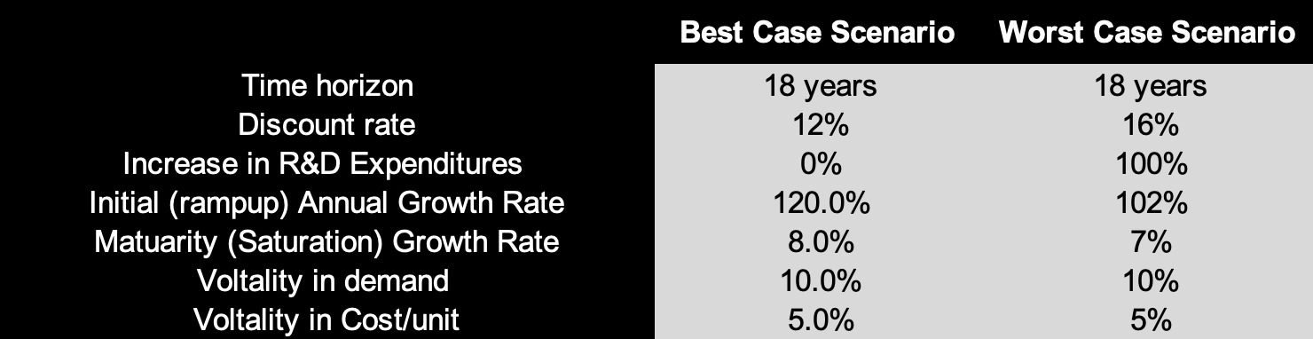 The model is based on several assumptions summarized in the table below. The model assumes a high ramp up growth rate at first, which is expected in this industry, and that would continue for the first 6 years of production, after that, the demand and supply would saturate and will start growth by 8% annually. Moreover, we perform uncertainty analysis, changing two key inputs: demand and production cost.