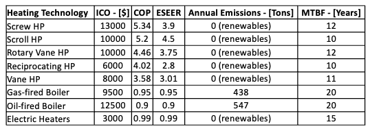 In this section, we delve into the strategic placement of our company's products in the heating technology market. This analysis uses critical performance indicators and market trends to benchmark our offerings against those of our competitors. By evaluating factors such as ICO, efficiency metrics like COP and ESEER, environmental impact through annual emissions, and product reliability indicated by MTBF, we gain a comprehensive understanding of our competitive edge. The technologies listed range from various types of heat pumps — including Screw, Scroll, Rotary Vane, Reciprocating, and Vane — to traditional heating systems like gas-fired and oil-fired boilers, as well as electric heaters. The comparison illustrates significant variations in initial costs, with heat pumps generally being more expensive upfront than traditional boilers and electric heaters. However, the efficiency of heat pumps, as indicated by the COP and ESEER values, is significantly higher than that of gas-fired or oil-fired boilers and electric heaters.