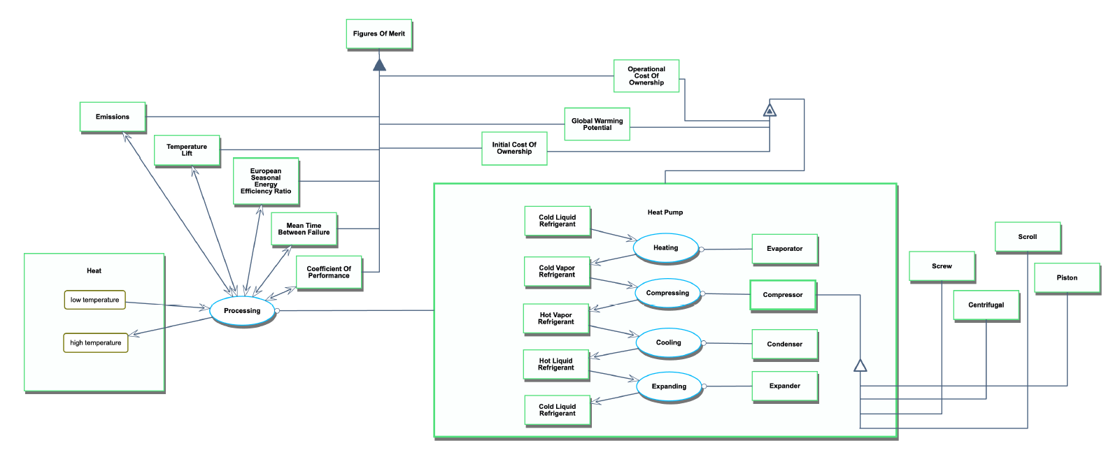 This Object-Process Diagram (OPD) presents a structured overview of a heat pump system, detailing the operational flow and interdependencies between the components and processes involved. At its core, the system's operational objective is clear: to transfer heat from a low-temperature source to a high-temperature sink, a fundamental characteristic of heat pump technology.