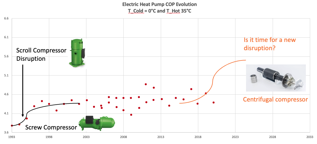 The figure above is exposing the first step change from screw compressor driven heat pumps to scroll compressor driven heat pumps in the early nineties. Since then the technology was improving slowly, the next step change improvement requires a different compression technology. Centrifugal compressors are a strong contender to deliver such value.