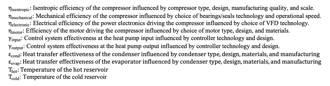 The figures depict the formula for the Coefficient of Performance (COP) for heating in a heat pump system, highlighting the impact of various component efficiencies on the overall COP. The COP is a measure of the heat pump's efficiency, calculated as the ratio of heating provided to the energy consumed