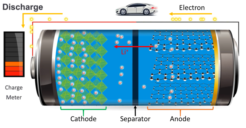 An electrical battery can store and use energy by chemical reaction. It is composed of an anode (-), a cathode (+), the electrolyte, and separator. The chemical reaction is a redox reaction caused by an electrical difference between the anode and the cathode. That is, electrons are expelled from the anode to the cathode via an external circuit and metal ion in the electrolyte receives the electrons on the cathode. This redox reaction lasts until electrical equilibrium. Although the primary battery is designed to be used once and discarded, the secondary battery can be recharged with electricity and reused. First secondary batteries based on Ni/Cd and Pd-acid were produced around 1900. After that, Ni/Zn battery which showed higher specific density appeared in the 1950s. In 1990, Lithium-ion battery (LIB) which is a major rechargeable battery today was released. The capabilities of LIB such as specific density, volumetric density, and cycle durability have improved more and more by developing new materials and the energy price is going down. These trends contribute to the growing availability of Electric vehicles.