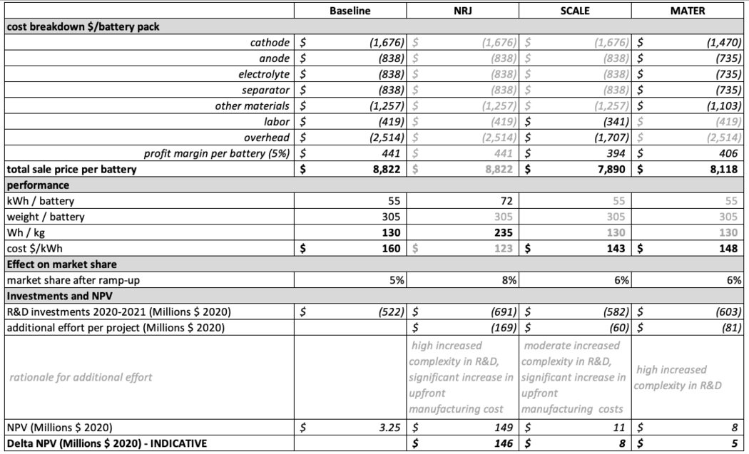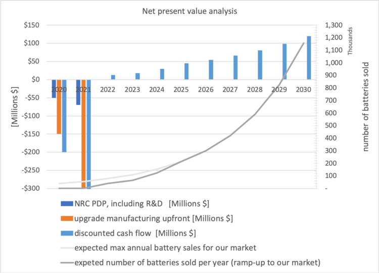 In this context, we carry on a baseline NPV analysis with a 10-year period of observation. We assume that our product is reaching and maintaining a share of 5% of the EV Market based (“free-riding” on the R&D, no additional investment) with a battery pack cost of 160$/kWh [5, 6], and an energy capacity per battery of 55 kWh (with a density of 130 Wh/kg). We use a discount rate of 15%. We include upfront expanses to upgrade manufacturing facilities, and non-recurring cost of the product development which include R&D expenditures. We allow 2 years of project development and start the sales in 2023 with a ramp-up to our full estimated market share from 2023 to 2025.