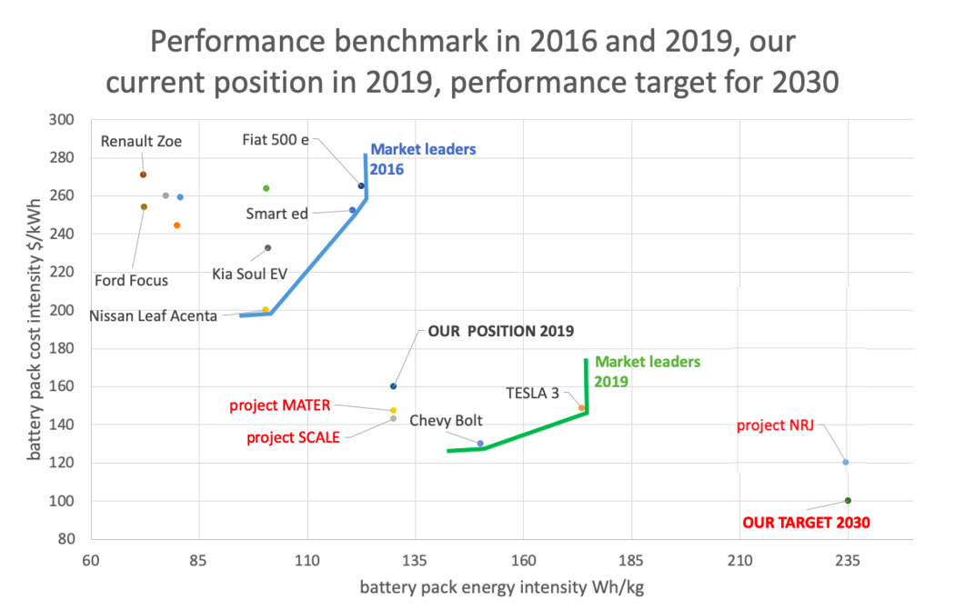 We position ourselves in the current market in terms of performance and set our target for a research and development projects portfolio to enable us to increase our market share from 5% to 10% by reaching a battery pack cost of 100$/kWh with a specific energy density of 235 Wh/kg (equivalent to a 72 kWh battery pack instead of 55 kWh today, keeping our current battery total weight constant at 305 kg).