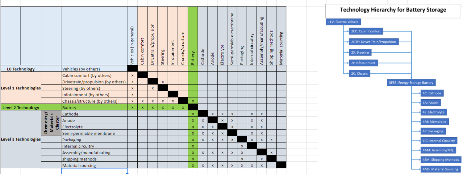 Our technology of interest is identified in the DSM above with green highlighting. it is portrayed in the context of the consuming technology of interest, electric vehicles, where we identified the typical consuming technology systems for reference. The diagram on the right is a dependency tree that has been extracted from the DSM. The battery storage technology consumes technology related to battery chemistry, including cathode, anode, catalyst, and semi-permeable membrane technologies. Battery technology also consumes technology related to the design of the shipping, manufacturing, material supply chain, and internal circuitry technologies