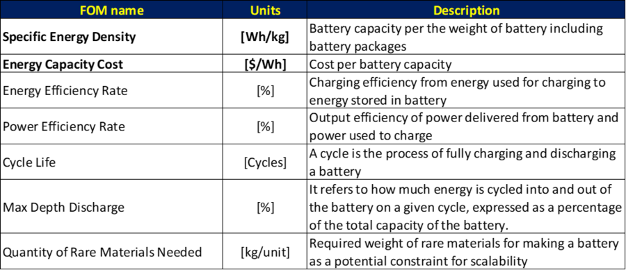 We identify several Figures of Merit (FOMs) for the energy storage via battery technology shown in a table below: