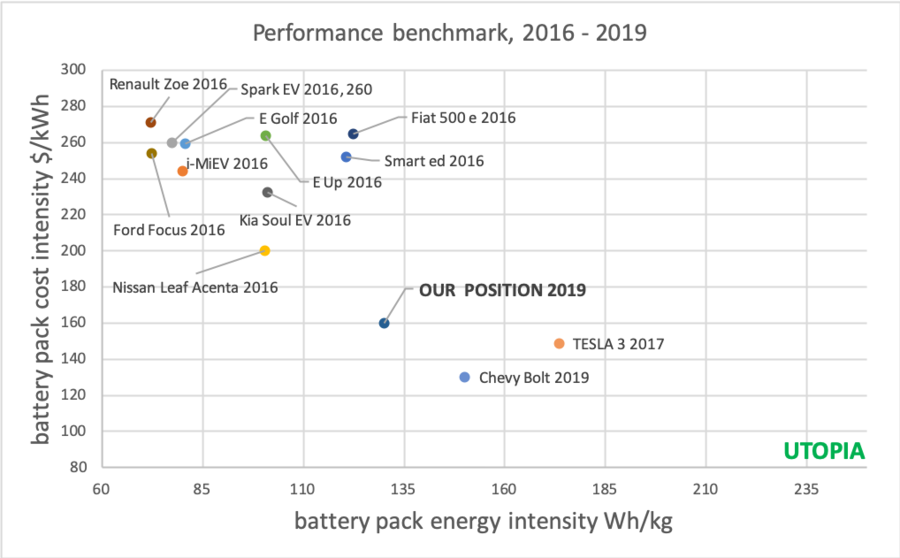 We position ourselves as a battery supplier of a mid-market, non dominant electric vehicle. We explore the performance of our competitors in 2016-2019 across our two fundamental FOMs of our battery pack: Energy intensity (Wh/kg) and Cost Intensity of energy ($/kWh). The graph provided below is based on this benchmark of battery packs performance used in different medium-size electric vehicles on the market.