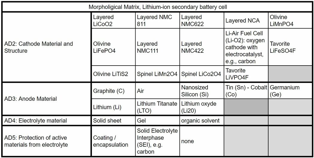 In order to assess the feasibility of technical targets, at the level of the battery roadmap, we develop a technical model. The purpose of this model is to evaluate the sensitivity of each technology development and its feasibility. As a first step, we develop a morphological matrix that shows architectural decisions for the next Lithium-Ion battery.