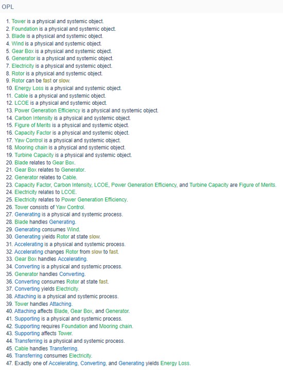 Team 20 hereby displays OPD of 3FOWTG – Floating Offshore Wind Turbine Generator (WTG) This consists of level 3 decomposed WTG, associated products and figure of merit (FOM). Associated OPL is displayed below. This represents the relationships among each object shown in the OPM above.