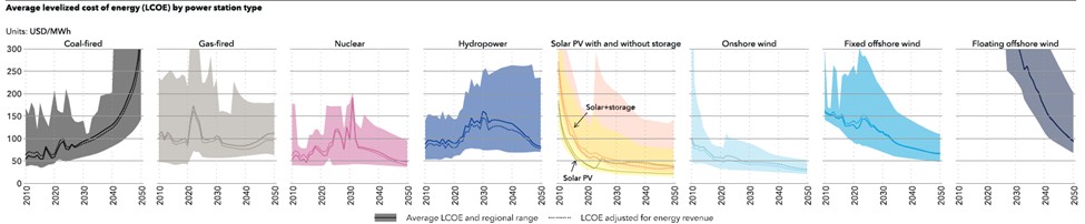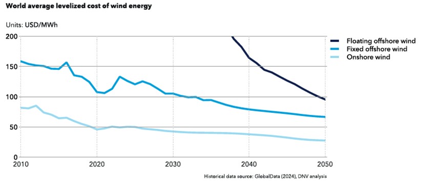 According to the Energy Transition Outlook 2024 (DNV, 2024), the LCOE (Levelized Cost of Energy) for floating offshore wind is the highest among types of wind power generation, standing at 290 USD/MWh as of 2024, which is more than double that of fixed offshore wind at 133 USD/MWh. However, due to increased deployment and the benefits of experiential learning, costs are expected to gradually decrease. By 2050, the global average LCOE for fixed offshore wind is projected to reach 67 USD/MWh, while that for floating offshore wind is expected to be approximately 96 USD/MWh, narrowing the difference to 45%.