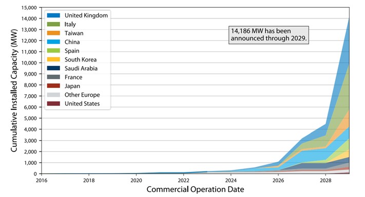 Although company-specific data is extremely limited, Figure below provides data on projected trends in each region. It shows the estimated cumulative deployment of floating offshore wind energy by country through 2029 for all projects with an announced COD in NREL's OWDB. According to this data, up to 14,186 MW may be installed by 2029, based on developer-announced CODs. Most of the deployment planned through 2029 is concentrated in the United Kingdom (4,242 MW), Italy (4,160 MW), Taiwan (1,530 MW), China (1,052 MW), and Spain (995 MW).