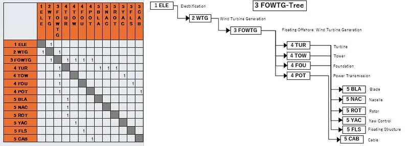 The 3FOWTG tree that we can extract from the DSM above shows us that the Floating Offshore Wind Turbine Generator (3FOWTG) is part of a larger industry-wide initiative on "Wind Turbine Generation" (2WTG), included in a type of electrification, and that it requires the following key enabling technologies at the subsystem level: 4TUR Turbine, 4TOW Tower, 4FOU Foundation, and 4POT Power Transmission. In turn, these require enabling technologies at level 5: 5BLA Blade, 5NAC Nacelle, 5ROT Rotor, 5YAC Yaw Control, 5FLS Floating Structure (such as the structure of spar and semi-submersible), and 5CAB Cable.
