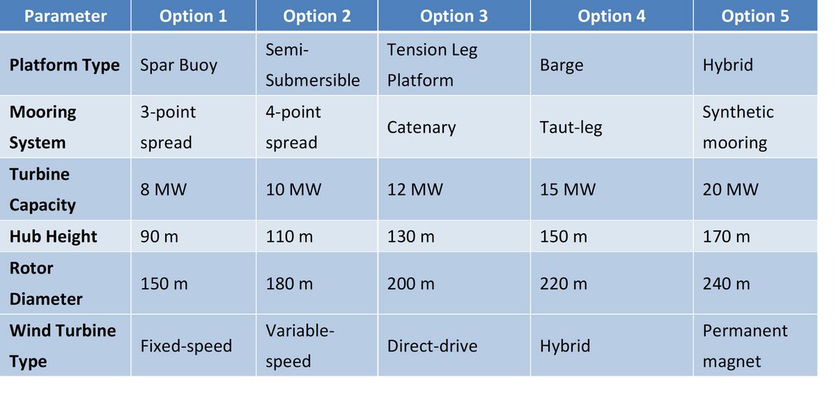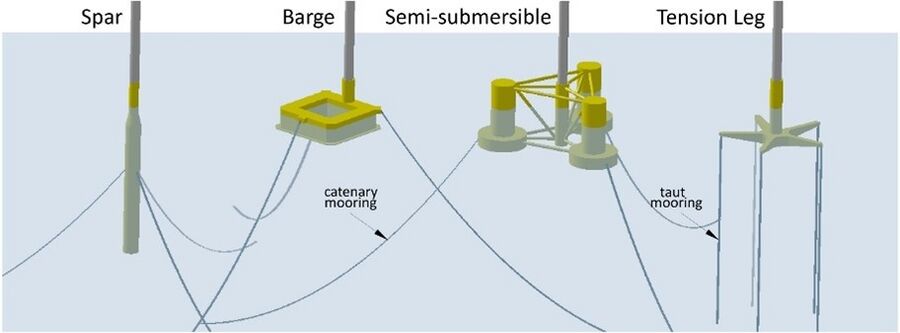 The three floating offshore wind foundation types (shown in the picture below) are considered prominent and developed globally. The Tension Leg Platform (TLP) uses taut mooring lines for excellent stability but requires precise anchoring, making it suitable for moderate depths (30–200 m). The Semi-Submersible is a buoyant platform with multiple columns, offering flexibility across depths (30–1000 m) and easier installation, making it a scalable option. The Spar-Buoy, a tall cylindrical structure with a deep draft, provides exceptional stability in deep waters (>100 m) but involves complex transport and installation. Each type is tailored to different site conditions and project requirements.