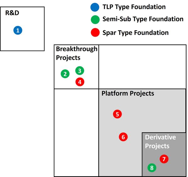 The portfolio shows that the currently adopted Spar-Buoy are primarily Platform Projects and Derivative Projects. The Semi-Submersible is considered a prominent option for the future, and it is undergoing a wide range of R&D, from Breakthrough Projects to Derivative Projects. On the other hand, TLP currently faces significant challenges, leading to a predominance of early-stage R&D Projects.