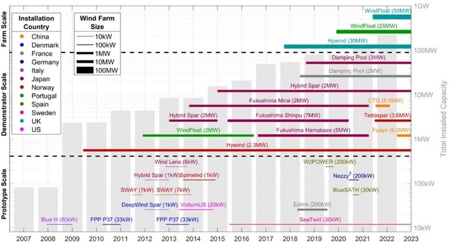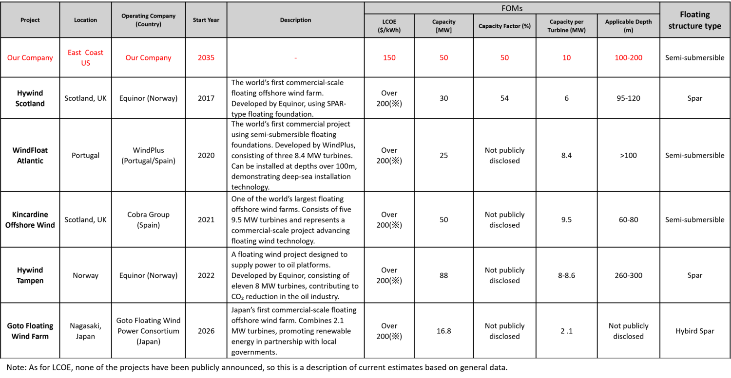 According to the "Offshore Wind Market Report: 2023 Edition" (National Renewable Energy Laboratory (NREL), 2024), the operating capacity of floating offshore wind reached 234 MW by the end of 2023. As of October 2024, there are very few commercially operational floating offshore wind projects. Additionally, information is quite limited since FOMs such as LCOE for each project have not been disclosed. However, the main projects and the FOMs for each project, as obtained through our research, are as follows.