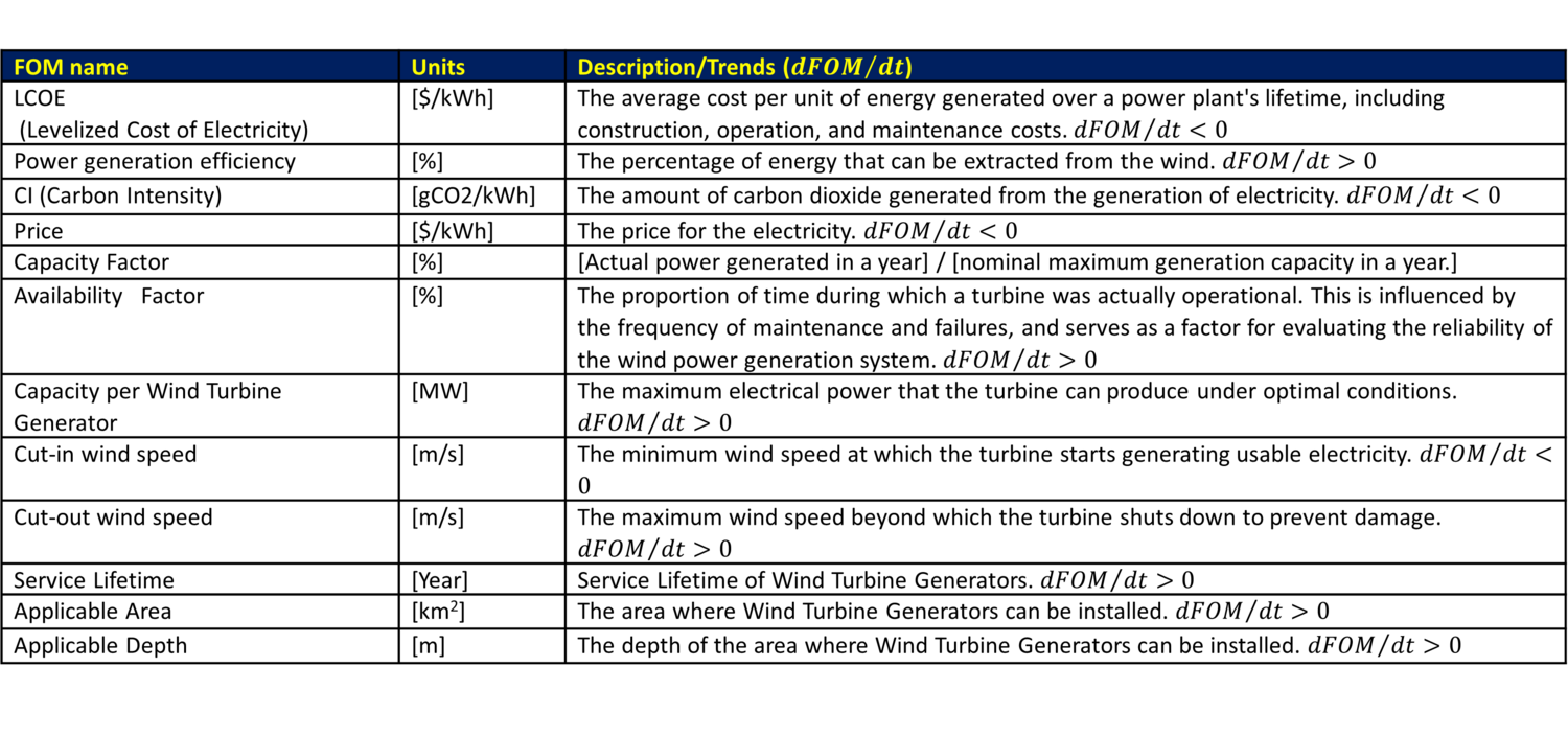 Our company serves as a floating offshore wind turbine generator development contractor, aiming to offer proposals to governments and power distributors interested in cost-effective wind energy solutions. The primary Figure of Merit (FOM) reflecting unit energy production cost—and, by extension, maximizing return on investment—is the Levelized Cost of Energy (LCOE). Lowering the LCOE indicates the capability to produce energy at a reduced overall cost, enhancing the project’s economic viability.