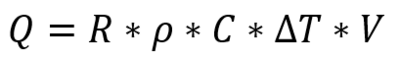 In this equation, Q is the product of a dimensionless recovery factor (R), the density of the rock (ρ), the heat capacity of the rock (C), the rock volume (V), and the temperature drop over the life of the system (ΔT)