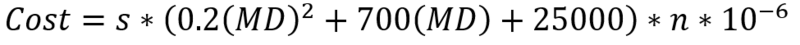 There are many methods and models to estimate the drilling costs associated with geothermal energy production. Available models vary in the input parameters and consider various variables to determine the overall drilling cost. These costs are also only an estimate due to the non-homogenous nature of the subsurface. For this analysis, we used the ThermoGIS model to estimate the drilling costs for each design vector. This model uses the following equation to estimate the total cost of drilling based on the combination of well depth and total lateral drilling length (Limberger et al.).