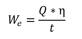 Here, the average electrical power output (We) over the lifetime of a geothermal system could be expressed as the recoverable heat (Q), multiplied by a conversion efficiency factor (η), divided by the life of the plant (t) (or the life of a geothermal well) which we will assume to be 30 years.