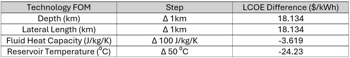 Using ThermoGIS drilling cost equation and the finite difference approximation method applied to a design vector representing the proposed Eavor-Loop 2.0 model design vector, we determined the incremental step changes in LCOE. The values of LCOE determined using finite difference approximation are shown in the table below.