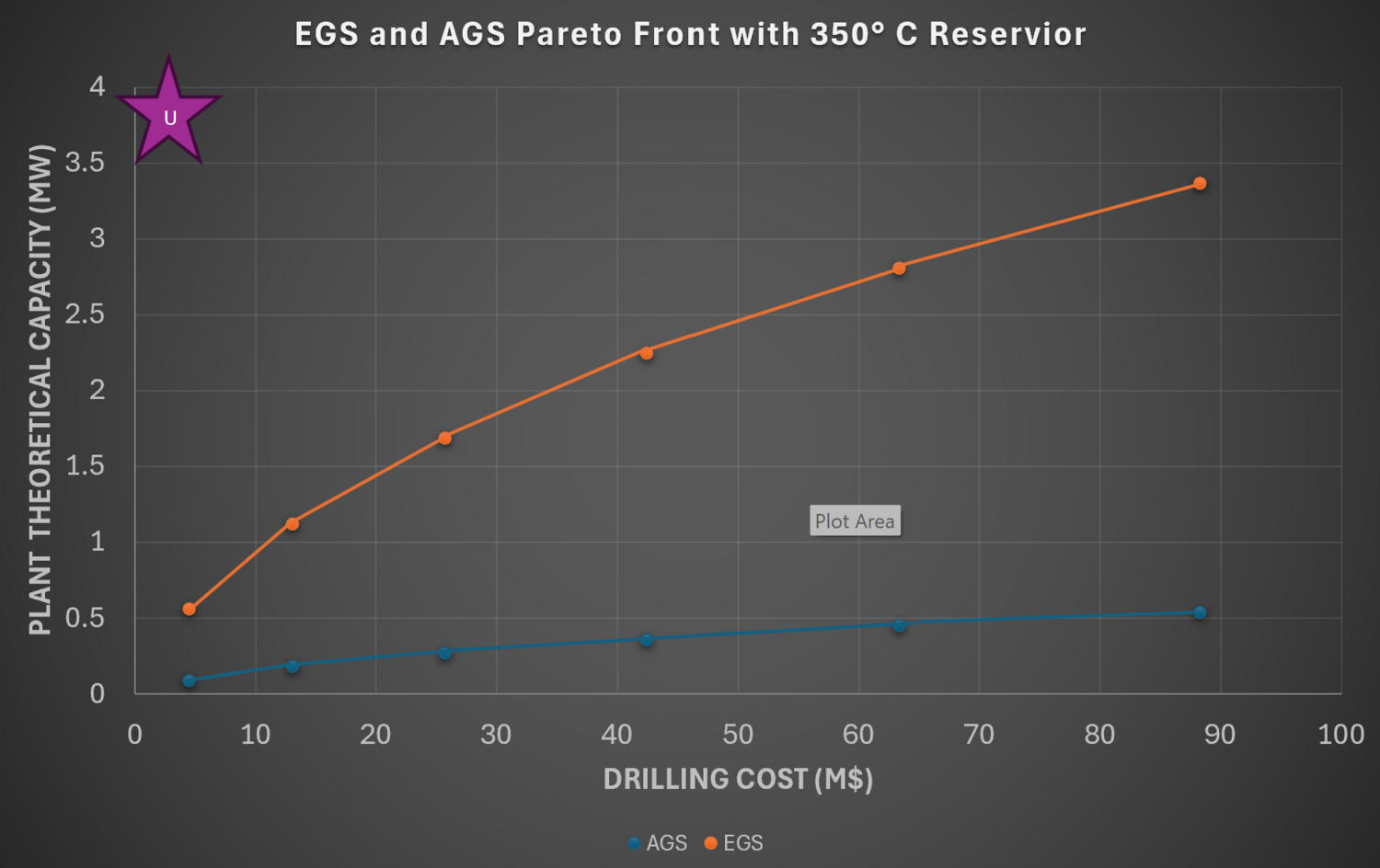 The following initial tradespace explores the relationship between a project's drilling costs, in a million USD, and the anticipated power plant capacity in MW. The design vectors displayed identify the differences in EGS and AGS technologies. The use case for this tradespace includes a geothermal reservoir at 350 degrees Celsius. The growth in drilling costs represents increases in the lateral length drilled. The longer the lateral length, the higher the drilling cost, but also the higher the theoretical plant capacity. This is due to the increase in volume of the reservoir area affected by the system. The larger the reservoir, the higher the theoretical plant capacity. In this plot, the orange points and pareto front represent an EGS while the blue points and pareto front represent an AGS. This shows the comparable theoretical plant capacities between EGS and AGS with identical depths and lateral lengths (effective drilling length). With the same effective drilling length, EGS provides significantly more capacity than AGS, with the difference growing with increased drilling costs.