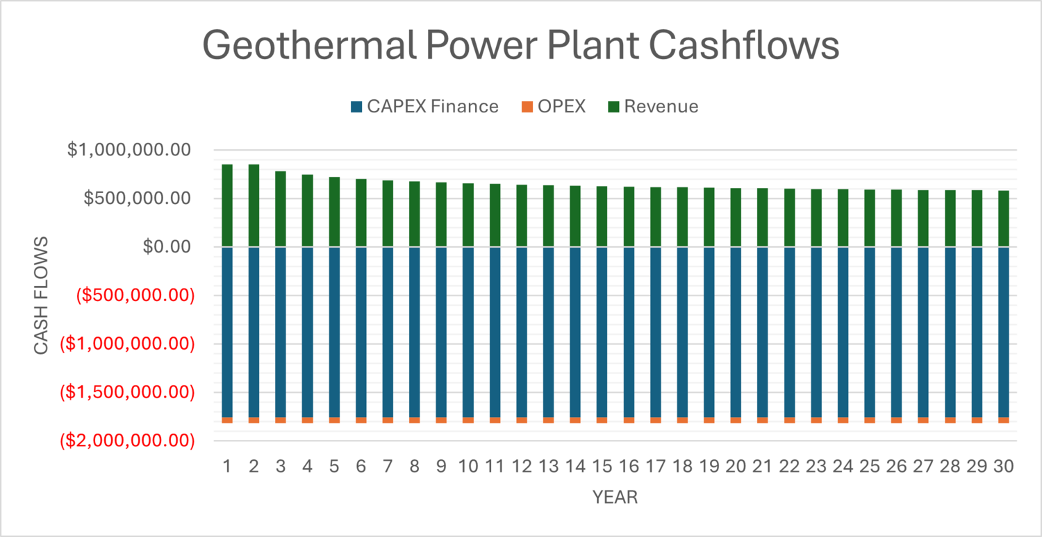 Using the parameters shown above, this model produces a total plant installation cost and the estimated net power output by year and the expected operation and maintenance costs (O&M) per year of operation. The to determine the yearly cashflow for this NPV model, the capital expenditure (CAPEX) for the plant is financed at 6% over the 30 year lifetime of the plant. This produces a yearly loan payment for our model. This CAPEX loan payment, O&M costs, and revenue from electricity sales produces the yearly cashflow. The following table shows the average value for each of these components through the lifetime of the plant: