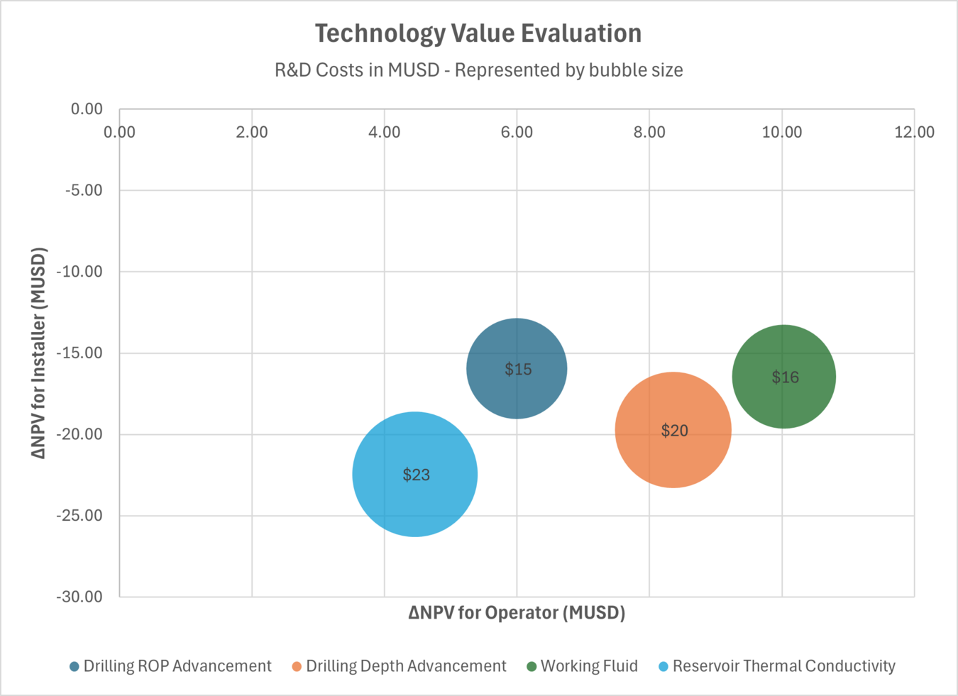 This section evaluates potential R&D efforts to improve the NPV for the baseline geothermal power plant used in the financial model. In the table below, each potential R&D innovation is evaluated for it's NPV change. This NPV change is broken down into two components, the value change for the "Installer" or entity that drills the geothermal boreholes and installs the surface power plant, and the "Operator" or entity that purchases the completed facility and is responsible for operation and electricity sales through the plant lifetime. It is important to note that for this change in NPV analysis for each innovation, the entire cost of R&D is covered by the Installer. This generally produces a negative project NPV for the installer, while producing a positive NPV for the operator. This is due to the cost of the R&D not being transferred into the overall cost of the facility. The change in facility installation benefits are captured and represented in the sale price of the facility from the Installer to the Operator, but the R&D costs required to achieve that change rest solely with the Installer. This remains constant through all innovation comparisons. These comparisons do not capture the changes to future projects from the Installer, which would also benefit from the R&D investment.