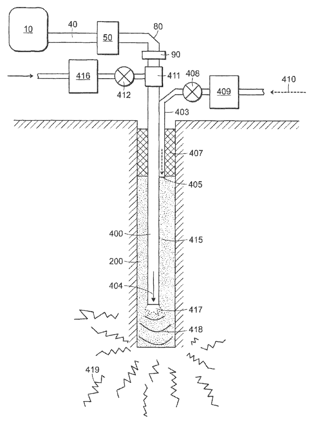 The Millimeter-Wave Drilling System patent (US Patent # 8,393,410 B2) is classified as E21B 7/14 in the Cooperative Patent Classification (CPC) system. In this system, E21B refers to technology related to Earth of Rock Drilling; Obtaining oil, gas, water, soluble or meltable materials or a slurry of minerals from wells and 7/14 adds the modifier Drilling by use of heat; e.g. flame drilling (CPC: E21B 7/14). We identified this system during our disruptive technology analysis. The classification of this system as using “flame drilling” instead of high energy waves likely identifies the novelty of the technology in the E21B “Earth and Rock Drilling” field. The Millimeter-Wave Drilling System identified in this patent uses millimeter waves generated by a gyrotron and funneled into a borehole by a proprietary waveguide to radically heat the rock at the leading edge of the hole. This rock can be heated to temperatures sufficient to vaporize the rock. This vapor is then exfiltrated out of the borehole using a purge gas system to allow for continuous advancement. If brought into commercial operation, this technology claims to radically decrease the cost of well boring at extreme depths. This would significantly change the cost considerations when considering implementing a geothermal power system.