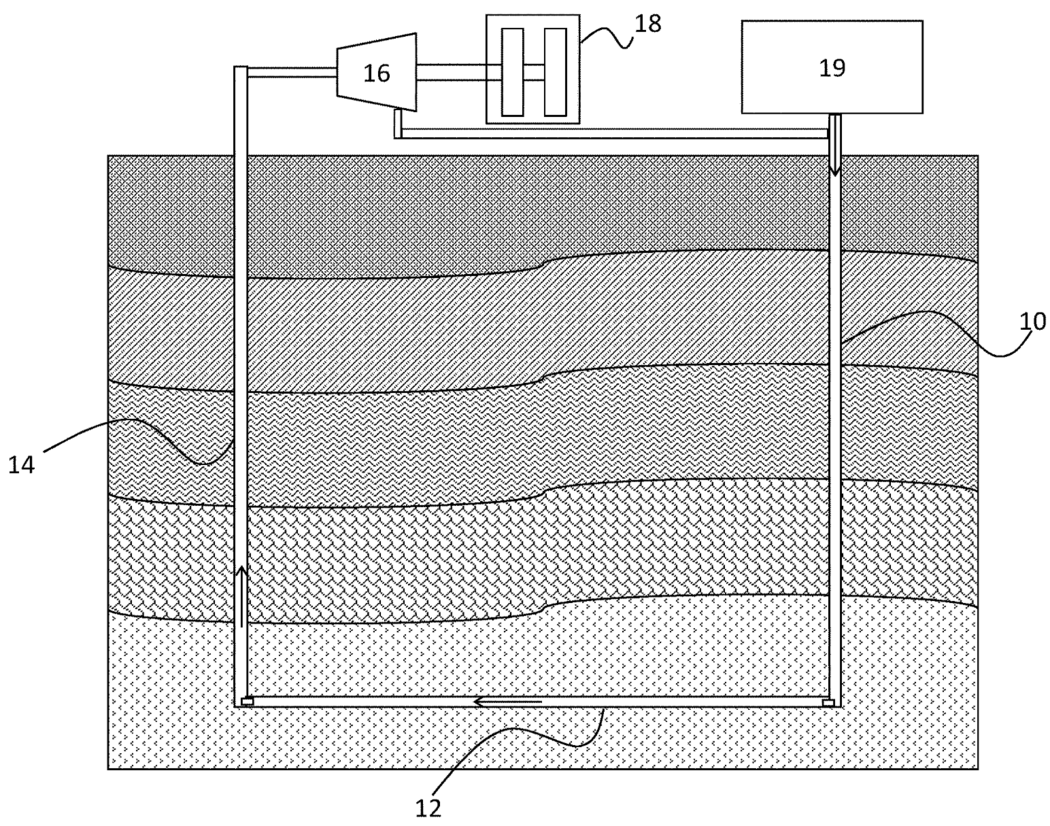 The Geothermal Loop Energy Production System (US Patent # 11,674,504 B2) has two classifications in the CPC system. They are F03G 7/04 and E21B 47/07. F03G 7/04 includes technology Spring, weight, inertia, or like motors; mechanical-power producing devices or mechanisms, not otherwise provided for or using pressure differences of thermal difference occurring in nature (CPC: F03G 7/04). E21B 47/07 includes a similar classification from the drilling technology but differs in purpose. This classification includes Earth or rock drilling, obtaining oil, gas, water, soluble or meltable materials, or a slurry of minerals from wells, and measuring the temperature of boreholes or wells (CPC: E21B 47/07). This technology utilizes the model principles in White et al. to generate electricity using supercritical CO2 (sCO2) in a closed-loop geothermal system. This design connects two vertical boreholes with a horizontal borehole running through a geothermal resource. The heated sCO2 is pumped through this subsurface system to a turbine to generate electricity. Once through the turbine, the sCO2 is compressed and sent back into the subsurface system to extract more heat. This closed-loop system can be implemented in a dry resource and does not require an existing or manufactured reservoir to operate. This increases the locational viability of the system to include more regions without easy access to subsurface permeable areas for heat.
