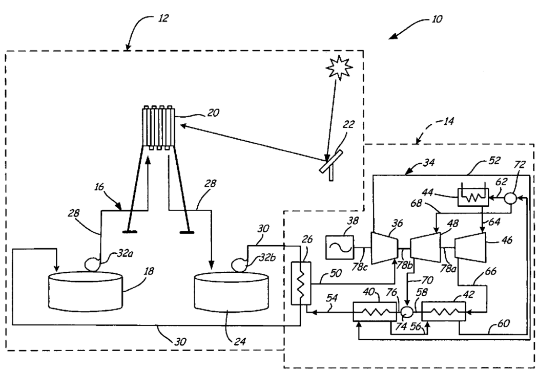 A significant patent related to this area is for a Supercritical CO2 Turbine for use in Solar Power Plants (US Patent # 7,685,820 B2). This system is classified as F03G 6/00 in the CPC. This classification includes Spring, weight, inertia, or like motors; mechanical-power-producing devices or mechanisms not otherwise provided for devices for producing mechanical power from solar energy (CPC: F03G 6/00). This patent may seem out of place when referring to geothermal power production, but the actual design only includes solar power plants to generate the initial heat required to run the turbine. The patent identifies that any process capable of providing heat to a heat exchanger could be an entity utilized in this design. The key piece of this design is the process of heating, compressing, and storing sCO2 as a working fluid to operate a turbine efficiently. This particular sCO2 turbine design is influential because it can utilize the working material with any significant heat resource and takes additional steps to capture unused heat energy to improve generation efficiency. This includes using three separate temperature recuperators to manage the sCO2 energy levels throughout the system. This allows the system to operate on a Brayton cycle, improving system efficiency over the Rankine cycle conversion system. This design also incorporates a heat storage system on the non-sCO2 side of the heat exchanger. This component includes nitrate salt storage tanks to store hot and cold salts during increased load demand.