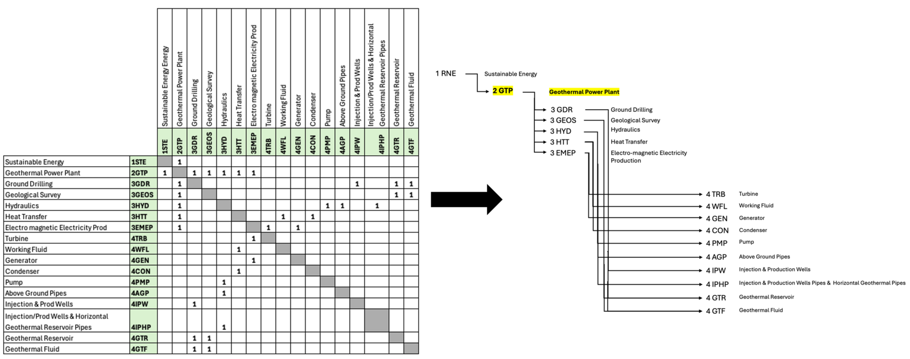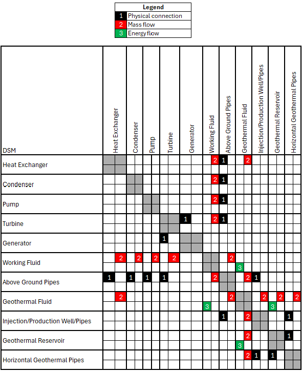 This Design Structure Matrix comprises 11 Level 3 elements representing both subsurface and above-surface components of geothermal power plants. It maps 40 total connections among these elements, including 18 physical connections, 18 mass flow connections, and 4 energy flow connections.