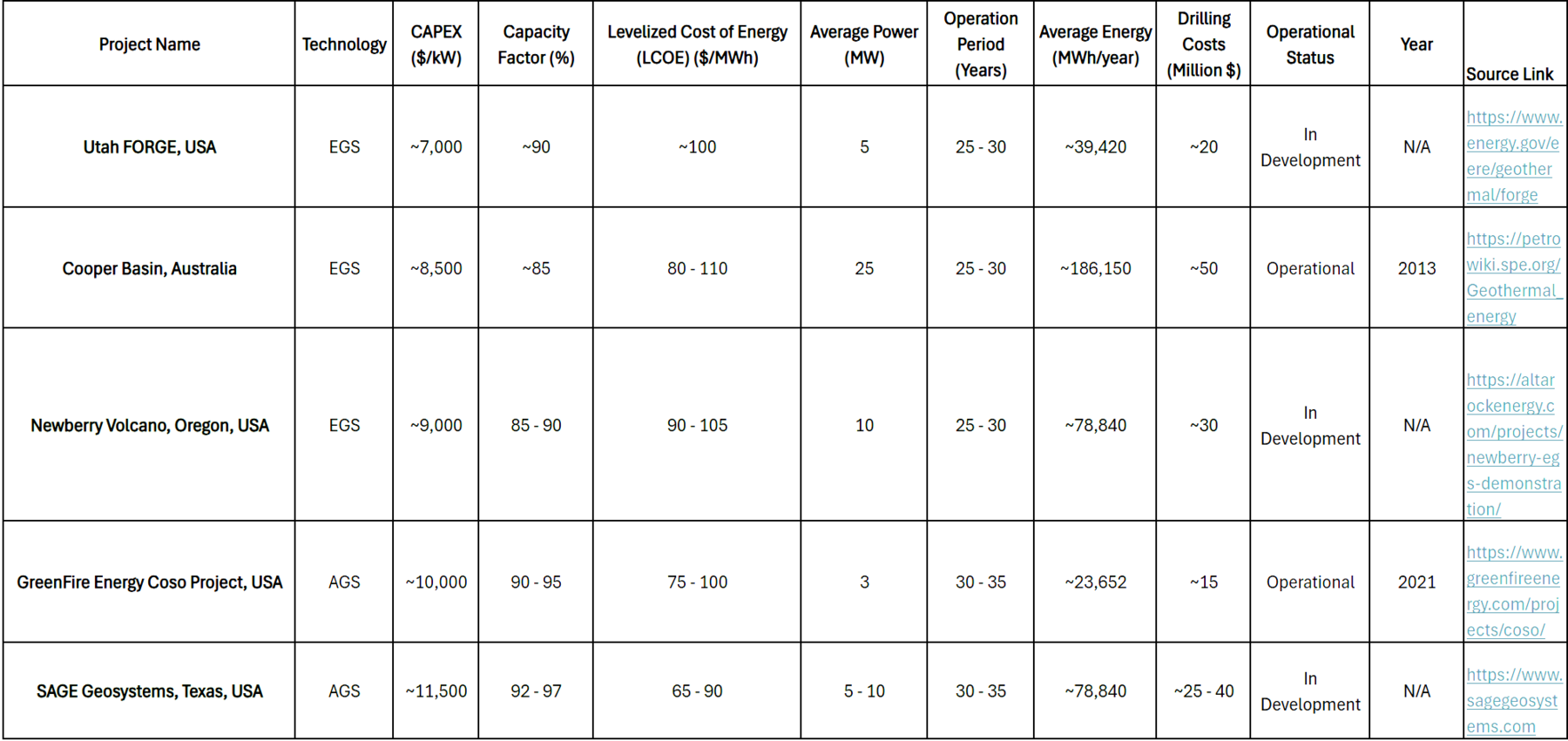 The key observations from the competitor analysis include the higher CAPEX required for AGS systems compared to EGS systems, a lower overall LCOE for AGS systems, and the differences in expected energy output and operational period between AGS and EGS. The two projects utilizing AGS technology include the GreenFire Energy Coso Project and the SAGE Geosystems Project, both located in the United States. The higher CAPEX for the AGS projects indicated the higher cost of implementing closed-loop systems. A higher CAPEX would usually lead to a higher project LCOE, but that is not true for the AGS projects. Both AGS projects have a lower expected LCOE than the EGS projects. The average power output for each AGS project is not significantly higher than that of the EGS projects, but the expected operation periods are longer. Therefore, companies utilizing AGS technology focus on lower and more consistent energy output over longer periods of time, whereas EGS technology will focus on more rapid utilization of a geothermal reservoir.