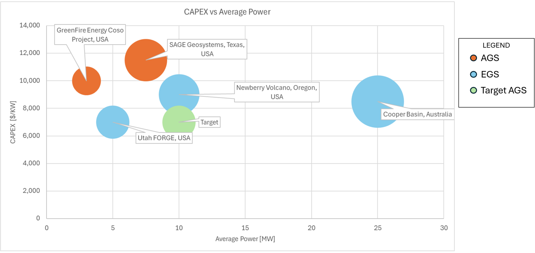 This roadmap targets an AGS with an average power of 10 MW and a CAPEX of $7,000/kW. This target would establish an AGS with competitive power generation in relation to existing EGS, while significantly reducing the CAPEX to align with current EGS. This would provide the economic utility of an EGS while maintaining the longer anticipated plant lifetime associated with AGS.