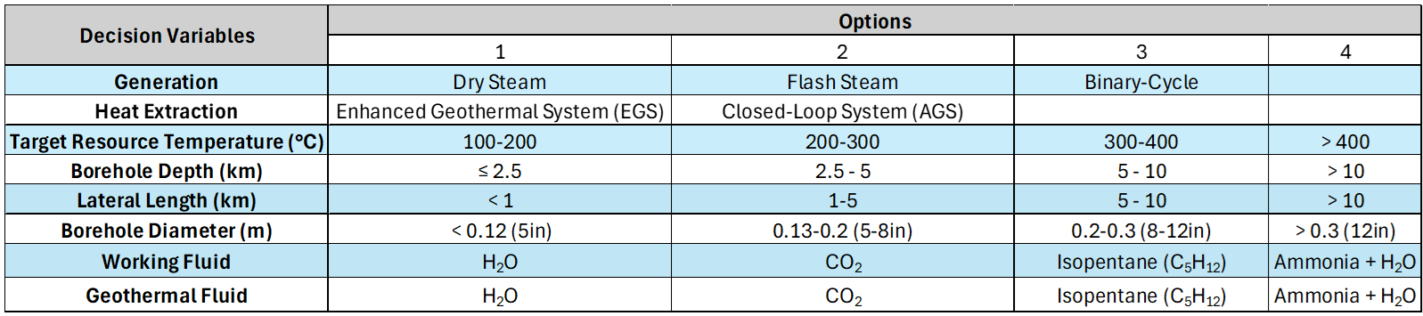 A morphological matrix is used to determine the potential design vectors for the development of a technical model for the geothermal power plant.