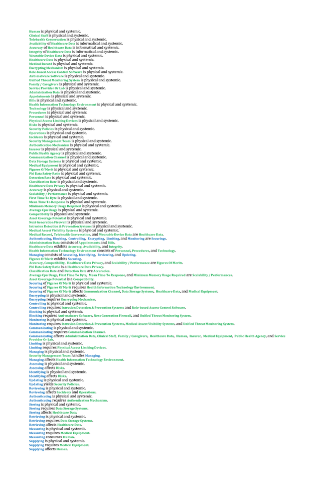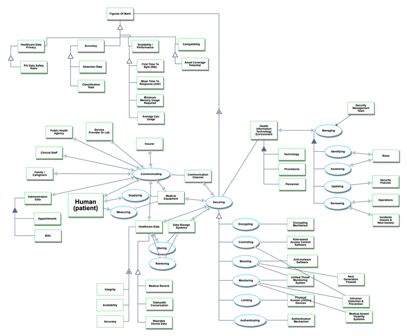 An OPM model is provided here for the 2HDS roadmap in the figure below. This diagram captures the main object of the roadmap (Healthcare Data Security), its decomposition into subsystems (Human Actors, Data Storage Systems, Communication Processes that interact with the Communication Channel, Securing Processes that interact with the Health Information Technology Environment, Health Organizations including Insurer, Service Provider or Lab, Public Health Agency, and Family/Caregivers), its characterization by Figures of Merit (FOMs) as well as the main processes (Communicating, Storing, Retrieving, Securing, and Managing). The potential Threat Actor is identified with the potential for the damaging process of Exploiting vulnerabilities in the elements of the system.