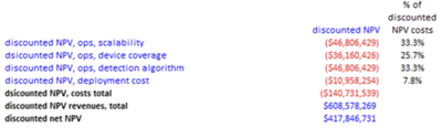 An excel spreadsheet is developed based on the outline of these model parameters. An initial (static) analysis provides an overview of relative Net Present Value (NPV) for the 3 product improvement R&D technology development projects, and the compute resource infrastructure R&D development project that is target to reduce the cost of deployment and setup at the hospital and their healthcare IT integration.