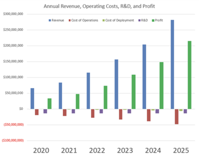 A key component of the financial model is the projected increase in market demand based on the threat landscape. The attack surface of hospitals will increase by at least 20% within a 5 year period, with expected continual growth. The attack surface increase is driven by moving offline medical devices online, or upgrading from older devices to IoMT. At the same time, the increasing attack surface area and a history of successful exploits will drive up the number of attacks on hospitals. From 2019 to 2020, ransomware attacks were expected to quadruple – COVID-19 and the election have altered these estimates, with hospitals experiencing up to a 75% uptick in ransomware attacks since Q1 2020.<ref>“25+ Healthcare Data Breaches Statistics [2020 Updated],” TechJury, Mar. 21, 2019. https://techjury.net/blog/healthcare-data-breaches-statistics/ (accessed Nov. 17, 2020)</ref><ref>“31 Alarming Healthcare Cybersecurity Statistics For 2020,” PhoenixNAP Global IT Services. https://phoenixnap.com/blog/healthcare-cybersecurity-statistics (accessed Nov. 18, 2020)</ref> These trajectories helped to inform our R&D portfolio prioritization and financial model.