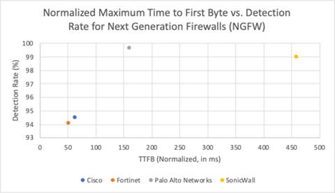 In 2020, the University of New Hampshire’s InterOperability Lab started a service to objectively certify different security solutions<ref>“CERTIFICATIONS | NetSec OPEN,” NetsecOPEN. https://www.netsecopen.org/certifications (accessed Dec. 03, 2020).</ref>. This is significant in that it serves as an objective, standardized assessment across multiple product offerings. We took the FOM First Time to First Byte as a proxy for possible detection speed given its relationship with latency, and viewed that in relation to Detection Rate.