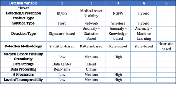 There is a high level of option variability in this space, each with particular cost/benefits. For example, from a solution-type standpoint, network-based tools are highly efficient but often fare poorly for zero-day cyber attacks or new variants. Host-based technologies are the opposite. This has led to the drive towards hybrid solutions. Wireless solutions are more applicable to mobile devices, which includes IoMT. While the general benefits, challenges and interrelationships among FOMs and decision variables are known, specifics are often difficult to find in literature given the apples-and-oranges comparisons and lack of real-to-life underlying assumptions in a test environment. Additionally, private cybersecurity firms do not wish to expose proprietary information regarding how their tools work.