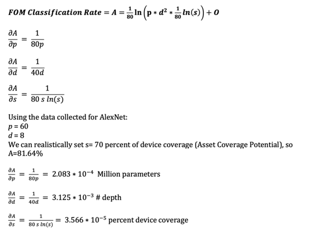 From a constraints standpoint, these detection algorithms have computational limits due to processing power<ref>F. Lin, Y. Zhou, X. An, I. You, and K. R. Choo, “Fair Resource Allocation in an Intrusion-Detection System for Edge Computing: Ensuring the Security of Internet of Things Devices,” IEEE Consumer Electronics Magazine, vol. 7, no. 6, pp. 45–50, Nov. 2018, doi: 10.1109/MCE.2018.285172</ref>. As algorithmic complexity via a greater number of parameters and depth increases, so to do the required instructions. Based on the literature and analysis, complexity has a logarithmic relationship with computations as well. We will set the FOM equation variables as follows: