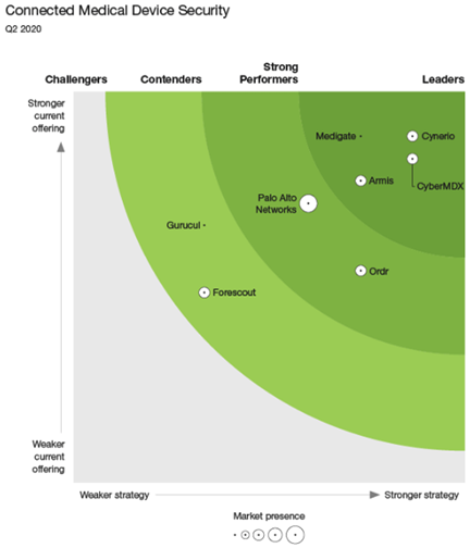 Security for the Internet of Medical Things (IoMT) is a relatively new industry with data often kept confidential. Key players in the medical device security space include companies such as CyberMDX, Medigate, Armis (acquired by Insight Partners), and Palo Alto Networks. These vendors have not subjected their tools to broad public assessments yet, nor are the underlying detection or visibility technologies well known. A general sense of relative position in industry based on a Forrester survey released in Q2 2020<ref name ="Forrester"></ref> is as follows: